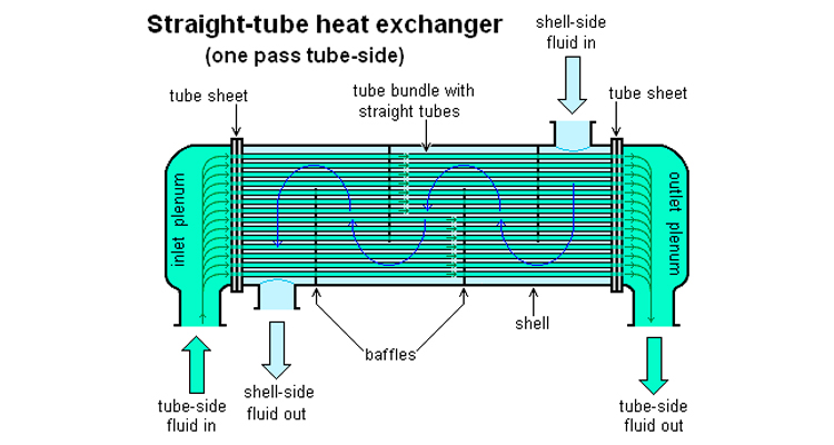 Les condenseurs de surface dans les centrales électriques sont souvent des échangeurs de chaleur à tube droit à 1 pass (voir le condenseur de surface pour le diagramme). Les conceptions de deux et quatre passes sont courantes car le liquide peut entrer et sortir du même côté. Cela rend la construction beaucoup plus simple.